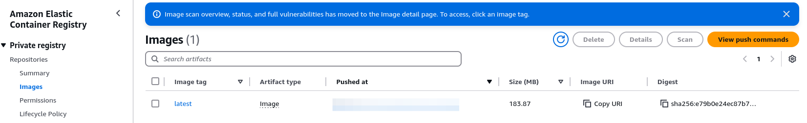 docker push <ECRレポジトリUri>:latestECRレポジトリにイメージが出現すれば成功です。