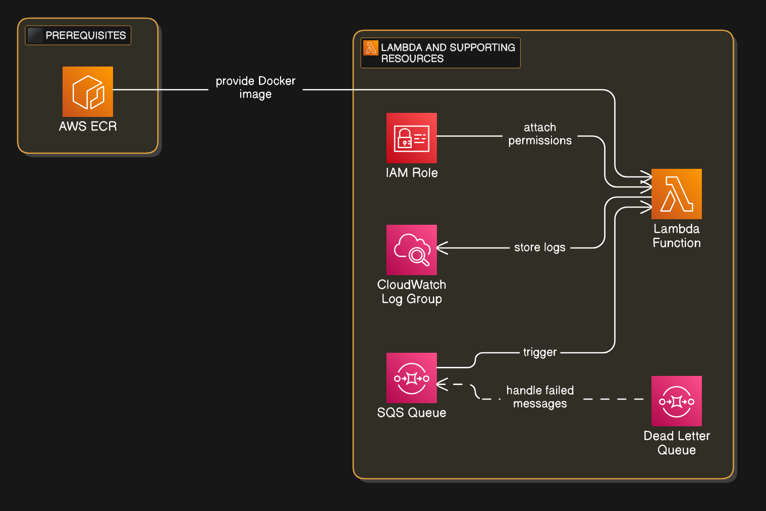 今回、Dockerのimage_uriをパラメータにすることで、後にDockerイメージが更新された際に新しいタグを簡単に変更できるようになります。また、Lambdaと取り巻きの名前を一括管理するために、resource_prefixというパラメータも用意してます。