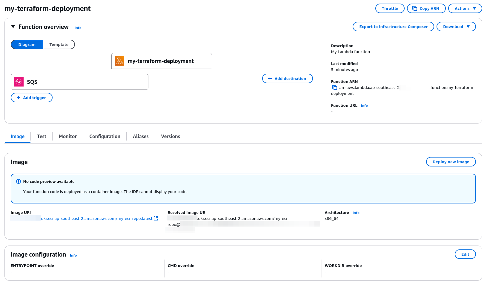 aws_sqs_queue.sqs_queue: Creation complete after 26s [id=https://sqs.ap-southeast-2.amazonaws.com/XXXXX/my-terraform-deployment-queue]コンソールを確認すると、SQSキューをトリガーにしたLambda functionが出来上がってます!召喚成功ですね!